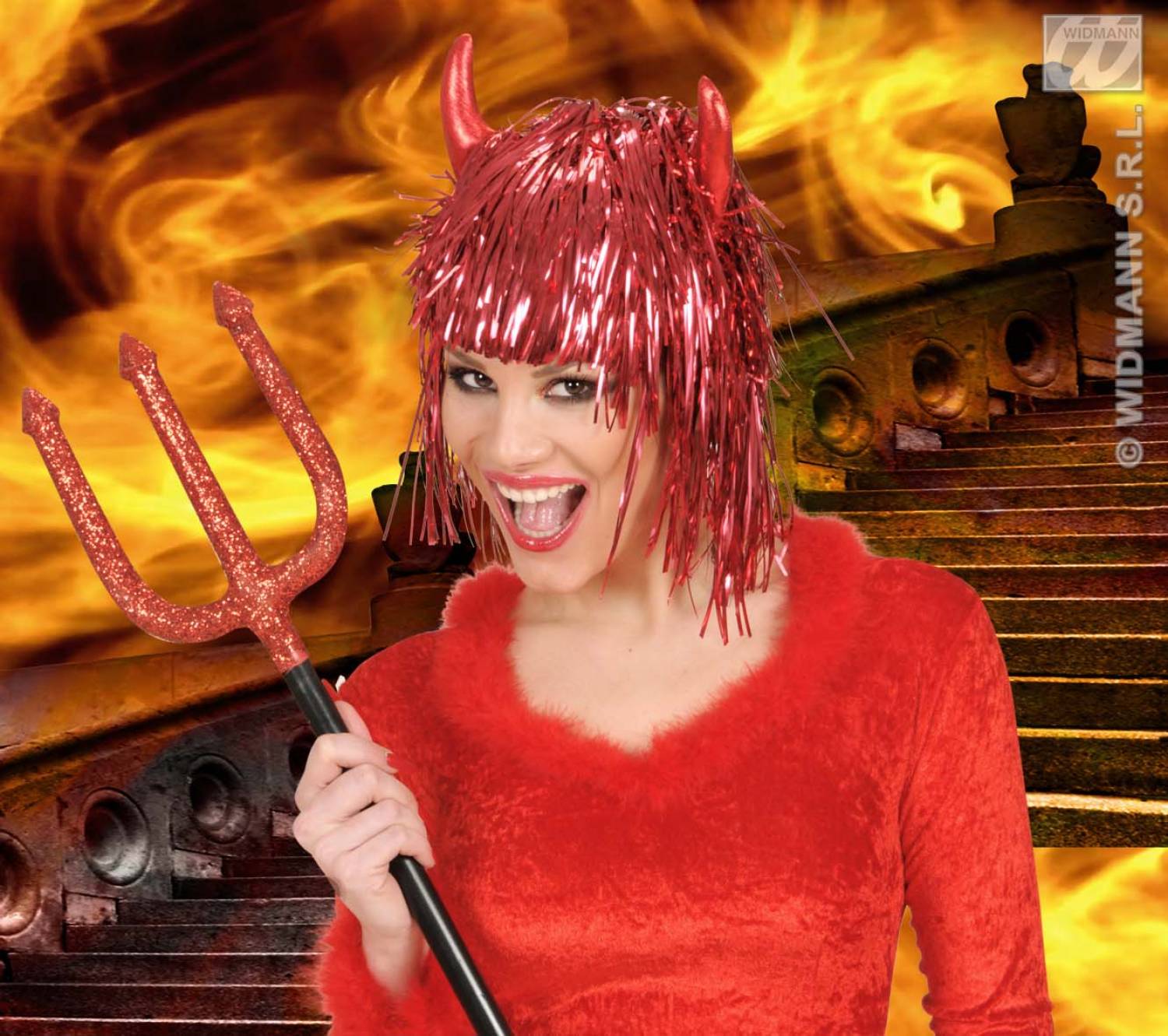 Deze rode duivels pruik met hoorntjes voor echte helse feestbeesten is grappig voor het pimpen van de aanstaande bruid op het vrijgezellenfeest. Met deze vuurrode pruik verander je jouw vriendin in een stoere en duivelse dame en dat is niet verkeerd op zo'n wilde laatste feestavond met vrienden vóór de huwelijksdag. Er zijn heel veel kleurrijke feestpruiken en rare kapsels dus voor elk vrijgezellenfeest thema zit er wel iets bij.
